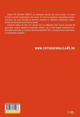 Caietul SA SCRIEM CORECT se adreseaza elevilor din ciclul primar, in scopul formarii corecte a deprinderilor de scriere. El vine in completarea manualelor scolare, exercitiile din caiet constituind premise necesare in realizarea obiectivelor educationale prevazute de curriculumul scolar.