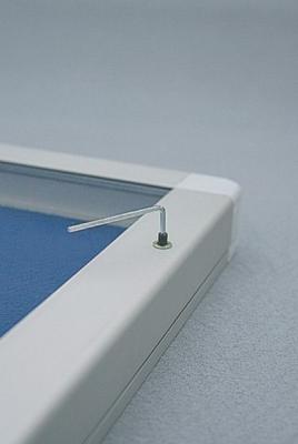 Partea frontala: sticla organica si rama din aluminiu, cu coltare ABS, prevazuta cu sistem de inchidere, pentru securizarea materialelor afisate.