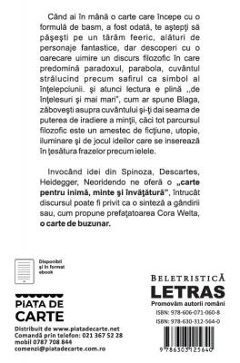 Cand ai in mana o carte care incepe cu o formula de basm, a fost odata, te astepti sa pasesti pe un taram feeric, alaturi de personaje fantastice, dar descoperi cu o oarecare uimire un discurs filozofic in care predomina paradoxul, parabola, cuvantul stralucind precum safirul ca simbol al intelepciunii. Si atunci lectura e plina ,,de intelesuri si mai mari”, cum ar spune Blaga, zabovesti asupra cuvantului si-ti dai seama de puterea de iradiere a mintii, caci tot parcursul filozofic este un amestec de fictiune, utopie, iluminare si de jocul ideilor care se insereaza in tesatura frazelor precum ielele.