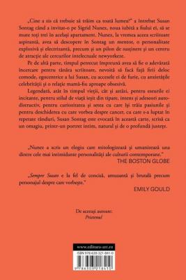 Legendara, atat in timpul vietii, cat si astazi, pentru eseurile ei incitante, pentru stilul de viata iesit din tipare, intens si adeseori autodistructiv, pentru curiozitatea si setea cu care isi traia pasiunile si pentru deschiderea cu care vorbea despre cancer, cu care s-a luptat in repetate randuri, Susan Sontag este evocata in aceasta carte, scrisa ca un omagiu, printr-un protret intim, natural si de o profunda justete.