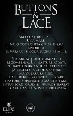 Cand Pearl este rapita de un barbat nemilos, viata ei se transforma intr-un cosmar din care nu pare sa existe scapare. Dar in spatele duritatii lui Crow, descopera un om care o atrage irezistibil. Intre teroare si dorinta, frica si pasiune, Buttons & Lace este inceputul unei povesti tulburatoare despre putere, supravietuire si o iubire neasteptata.