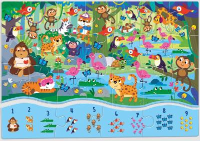 Dupa asamblarea imaginii, distractia continua cu activitati practice de numarare si asociere. Fiecare piesa este marcata cu un numar de la 1 la 9, iar provocarea consta in identificarea si numararea obiectelor corespunzatoare fiecarui numar. De exemplu, copiii pot cauta 3 maimute pentru numarul 3 sau 7 fluturi pentru numarul 7.