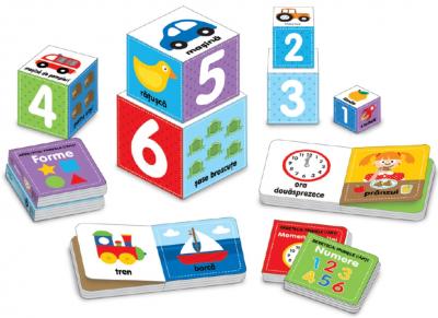 Un set de sase carticele frumos ilustrate cu ajutorul caruia cei mici vor invata culorile, numerele, formele, primele cuvinte, contrariile, precum si momentele zilei. Cele sase cuburi ce le insotesc pot fi stivuite, contribuind la dezvoltarea dexteritatii, a coordonarii ochi–mana si a abilitatilor de invatare prin joaca.