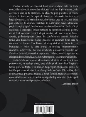 Cartea aceasta se cheama Labirintul si chiar este, in toate sensurile stravechi ale cuvantului, un labirint. E si constructie in care nu-i usor sa te orientezi, ba chiar te poti pierde; e si traseu sinuos, in tenebre, la capatul caruia se intrevede lumina; e si hatisul visceral, salbatic din noi, din care ai vrea sa iesi, pas dupa pas, eliberat. Si atunci, inaintezi in Labirintul Ilenei Moroianu pagina dupa pagina, in cautarea unui sens lamuritor. lar la sfarsit il gasesti, il intelegi si te lasi patruns de luminozitatea lui pentru ca ai fost condus, cuvant dupa cuvant, de vocea unei femei aparte, psihoterapeuta Lena. In confesiunea acestei Ariadne firave din Bucurestiul zilelor noastre se ascunde firul care te conduce la liman. Un liman al dragostei si al indurarii, al bunatatii si milei cu care ajungi sa intelegi resentimentele, rautatea, indiferenta, dar mai ales boala si moartea celor din jur. Dupa ce, in urma, s-au stins treptat ura, mania, revolta, asa cum au sfasiat si destramat ele, de-a lungul timpului, tesatura unei familii.