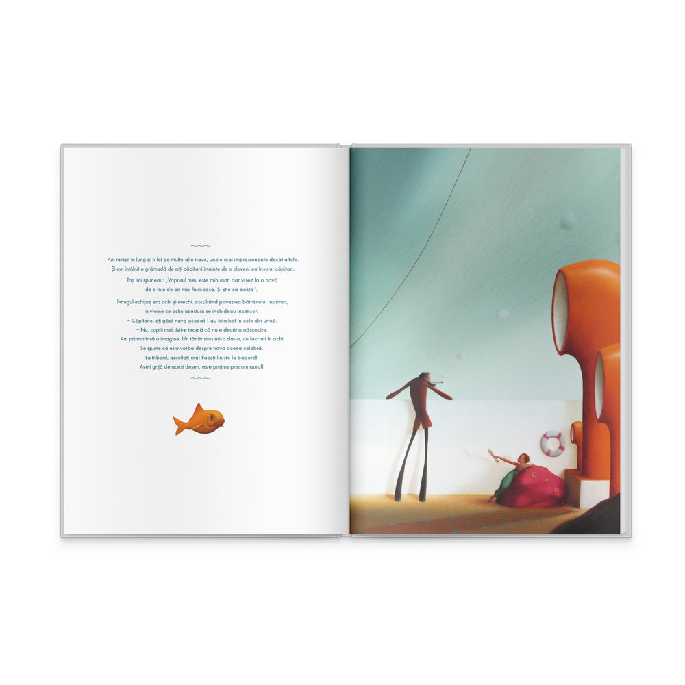 Cheia intelegerii semanticii textuale, a cautarilor reiterate de cuvintele celorlalti capitani, dar si a neputintei de a afla adevarul despre nava fabuloasa, nu trebuie cautata in litera, in ceea ce se vede, ci in sens, in ceea ce se ravneste. Din acest punct de vedere, descrierile capitanilor reprezinta piesele unui puzzle dezvaluit cititorului ca intreg abia in ultima ilustratie a cartii. Imaginile proiectate de acestia asupra navei inchipuite alcatuiesc perspectiva unui spatiu „ca un refugiu in mijlocul furtunilor”, unde „viata e tare placuta” si „trepidanta, plina de inventii si de ispravi nemaipomenite”! Acel loc atat de cautat si de dorit, asa cum ni-l descopera desenul la fel de pretios ca aurul, este… acasa! Casa mea, a ta, a fiecaruia dintre noi!
