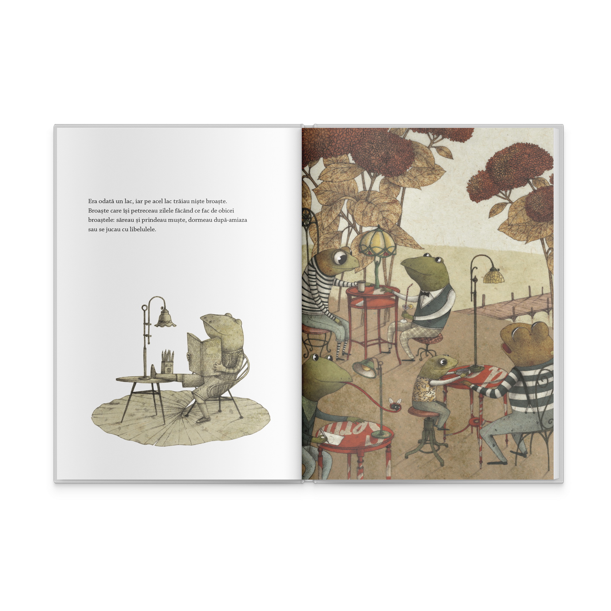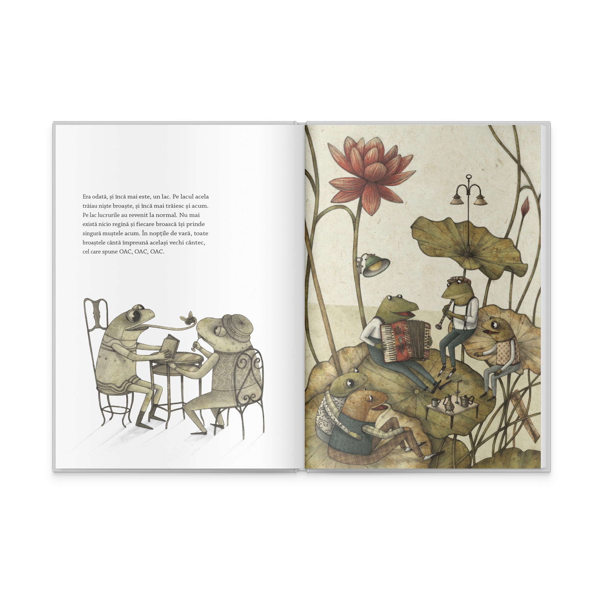 Ni se spune, asadar, ca pe un lac oarecare traiau odata niste broaste. Acestea nu se evidentiau cu nimic, deoarece obiceiurile lor erau dintre cele comune: sareau si prindeau muste, dormeau dupa-amiaza ori se jucau cu libelulele. Si se distrau cantand impreuna celebrul oac! oac! oac!. Insa, toate acestea pana intr-o seara, cand ceva a aterizat in lac.