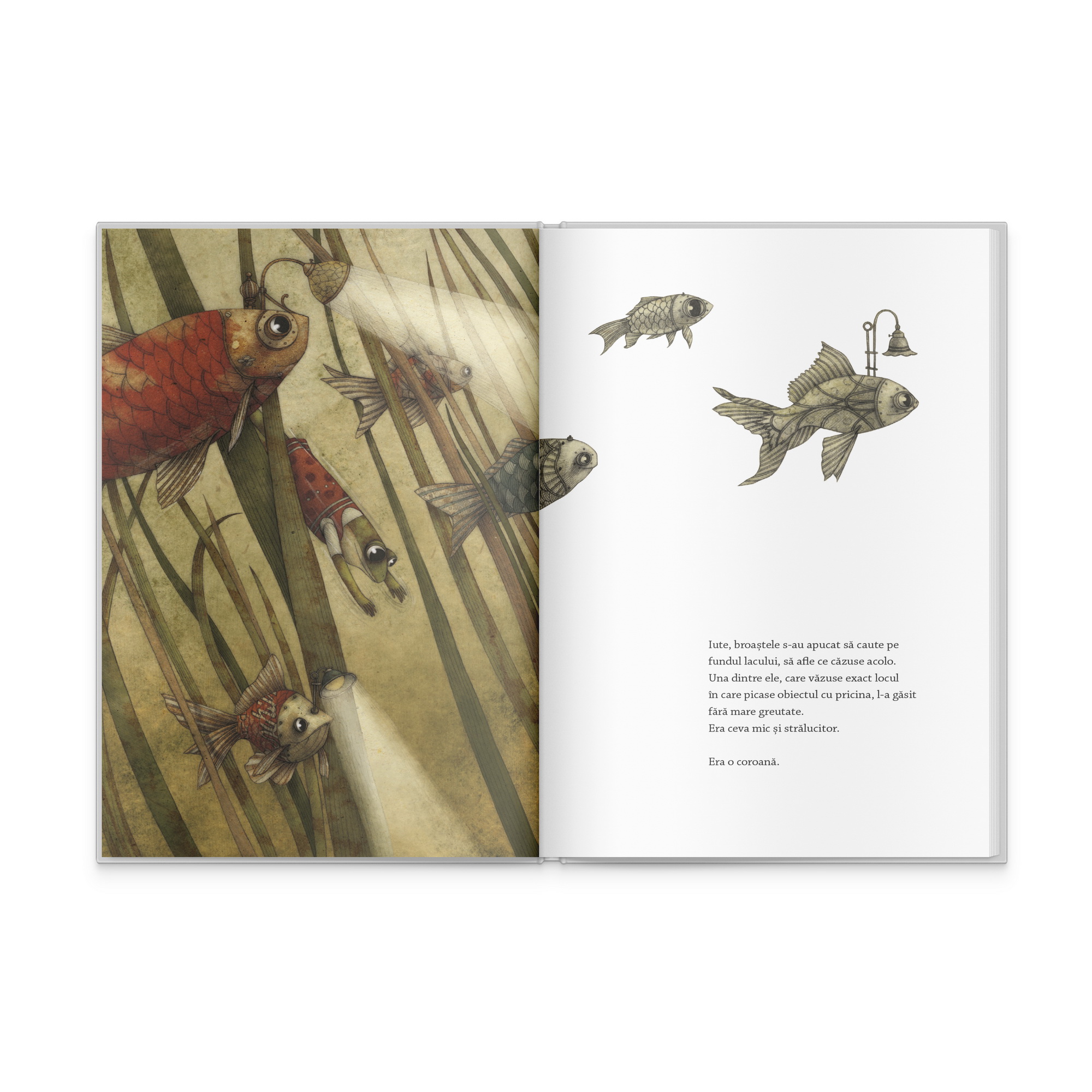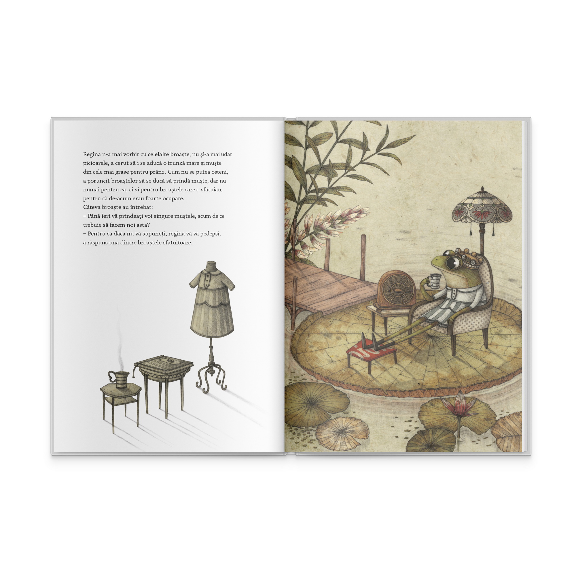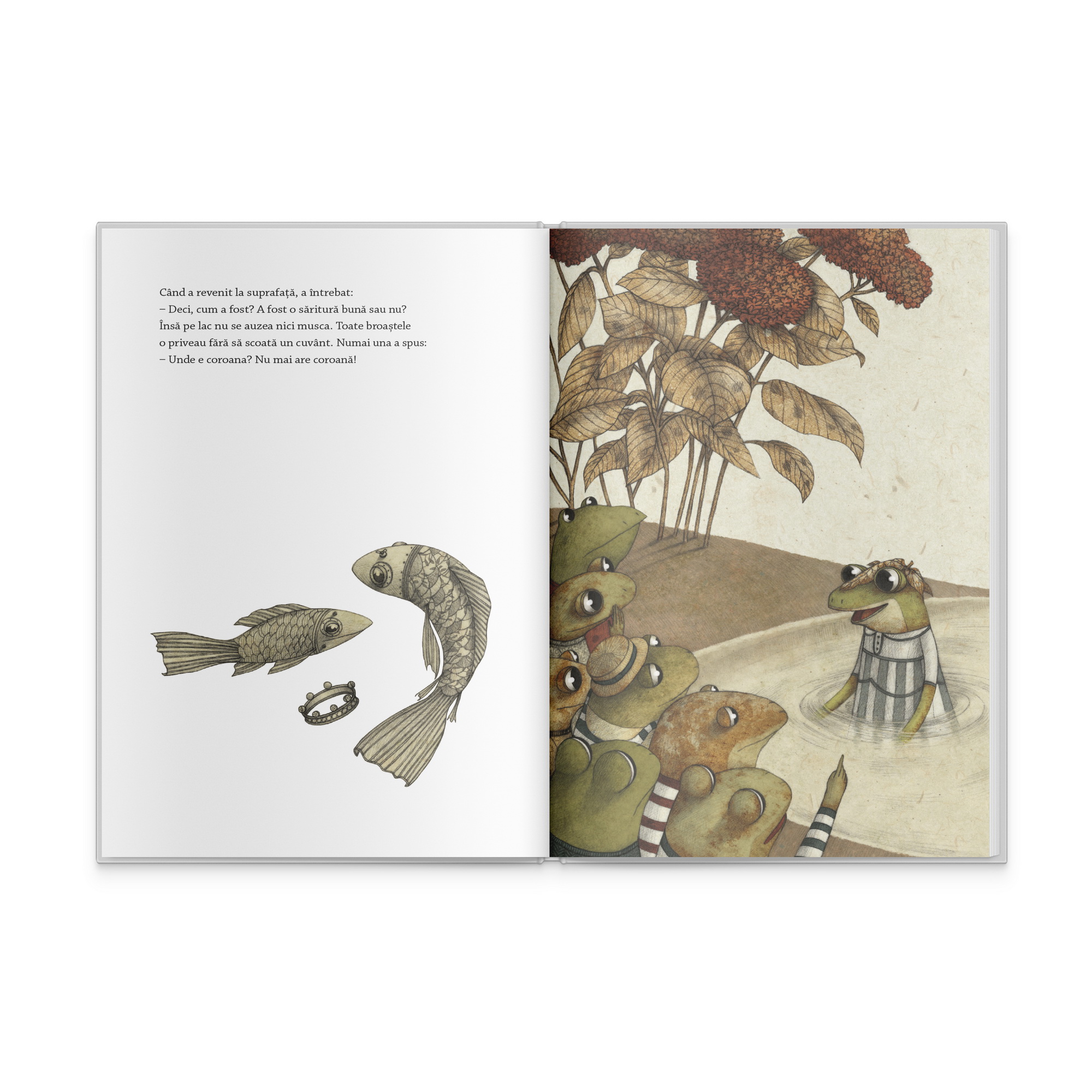 O coroana! Iar broasca aventurata pe fundul lacului pentru a o gasi a fost incoronata. Dar congenerele sale nu mai vazusera pana atunci o regina, de aceea nu stiau nici ce presupune investirea in acest rang. Situatia a fost repede lamurita de cateva broaste cu initiativa, iar neamul brostesc se diviza in paturi sociale demne de o monarhie. Astfel, regina nu mai comunica cu celelalte surate si nu se mai ostenea pentru nimic; avea sfatuitori si putea pedepsi pe oricine nu i se supunea.