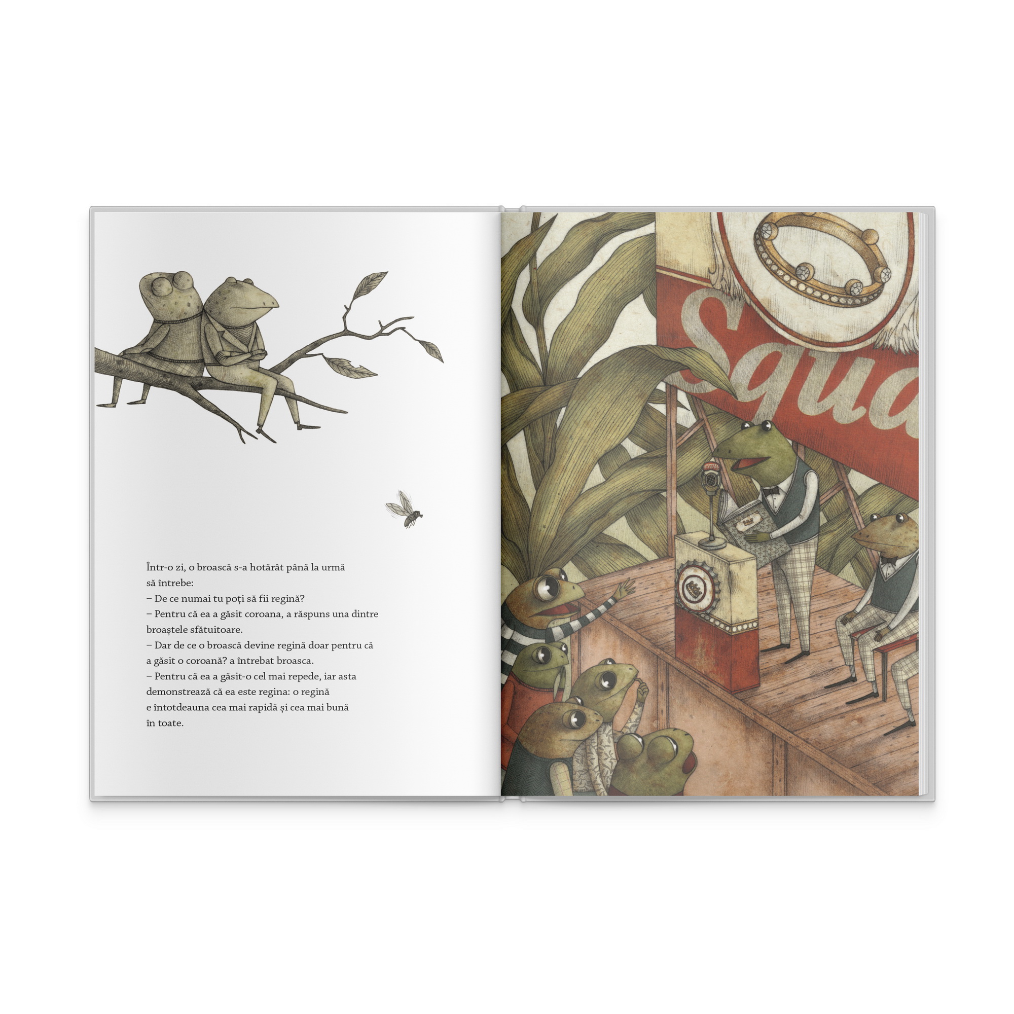 Oracaitul broastelor rasuna in aceeasi cadenta dintotdeauna. Si totusi, a existat o vreme in care broastele nu au mai cantat! A existat si o vreme in care broastele erau conduse de-o regina. Dar acele vremuri au apus, iar micile amfibii si-au reluat indeletnicirile consacrate. Davide Cali si Marco Somà au fost martori schimbarilor si le-au cuprins, pentru invatatura noastra, in paginile cartii „Regina broastelor”.