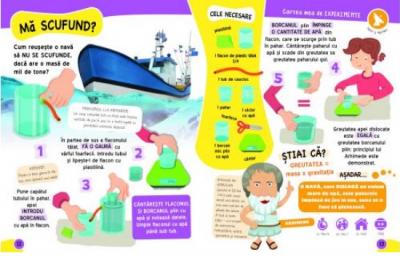 O carte de experimente este un bun prilej sa descoperi singur, prin incercari si observatii, cat de fascinant este mediul in care traim. Aceasta carte ii invita pe copiii de 9-13 ani sa exploreze secretele fenomenelor din natura si sa se convinga, prin experimentele pe care le vor face chiar ei, de corectitudinea unor legi ale fizicii si chimiei. Vor afla cum reuseste o nava care are o masa de mii de tone sa nu se scufunde; de ce plasticul, desi este foarte sensibil la caldura, pe gratar, deasupra jarului, nu se topeste; cum poate o barca sa se miste pe apa repede fara a folosi puterea vantului; cum se decojeste un ou fara sa-l atingi si multe altele. Vor face un caleidoscop, un zmeu si vor construi chiar si o parasuta foarte usor, fiindca vor gasi in carte toate instructiunile pas cu pas, descrise clar, si materialele de care au nevoie la fiecare experiment. Iar explicatiile accesibile, curiozitatile si informatiile complementare despre gradul de dificultate, timpul cat dureaza experimentul, unde poate sa il faca, acasa sau in aer liber, singur sau in prezenta unui adult fac aceasta carte si mai atragatoare pentru elevii curiosi.