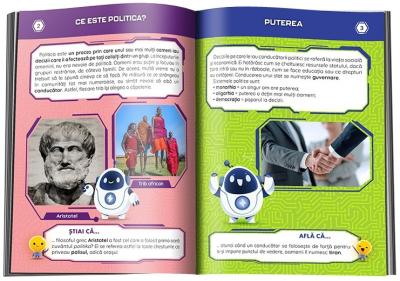 Daca esti curios cum au luat nastere si cum sunt conduse tarile lumii, vei afla ce este politica, unde a aparut primul stat, ce este o constitutie si multe altele. Sectiunile Cel mai..., Asa a devenit celebru..., Legenda spune ca..., Afla ca... si Stiai ca... contin cateva dintre cele mai captivante curiozitati cu care iti vei da pe spate colegii, prietenii, ba poate chiar si profesorii!