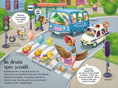 Cum trebuie sa traversezi strada? Ce semnifica indicatoarele rutiere si culorile semaforului? Cu ajutorul acestei carti captivante, vei invata tot ce trebuie sa stii despre deplasarea in siguranta pe strada, in parcuri sau in curti. Exploreaza diverse situatii in trafic, asculta sunetele pe care le produc masinile memorizeaza regulile de circulatie!