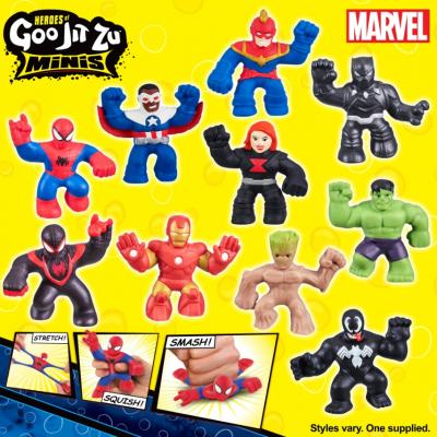 Multi eroi Marvel preferati sunt disponibili in aceasta gama Mini Goo Jit Zu, inclusiv Sipder-Man, Hulk, Captain America-Sam Wilson, Venom, Captain Marvel, Miles Morales, Groot, Black Widow, Iron Man si Black Panther.
