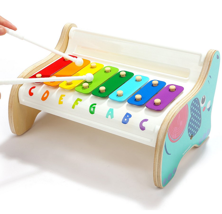 • cele opt clape muzicale colorate scot sunete dragalase atunci cand cei mici le ating cu betisoarele speciale, incurajandu-i sa creeze si sa descopere zeci de combinatii care sa le incante auzul
