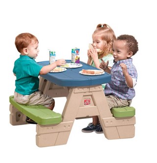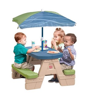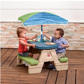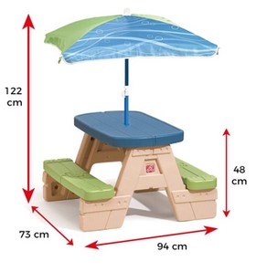 Masa de picnic cu umbrela detasabila si 4 locuri pe bancute pentru copii mici (~1.5-4 ani). Se poate folosi atat la interior, cat si la exterior pentru diverse activitati sau pentru a lua o gustare. Se poate dezasambla usor si se poate plia pentru a fi depozitata.
