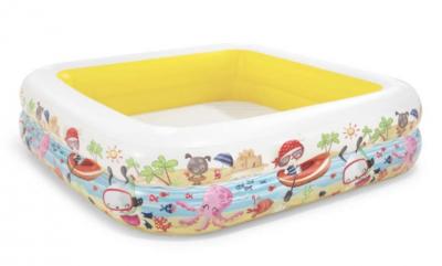 Dimensiunea piscinei este de 157x157x122 cm, avand o capacitate de 295 litri de apa. Peretii laterali lati si parasolarul foarte mare permit un timp de joaca grozav la umbra.