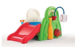 Contine platforma cu tobogan si elemente sportive de baschet si baseball.