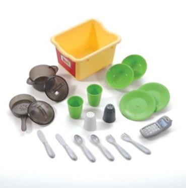 Contine tigaie pentru prajit si oala pentru fiert cu capac ce emite electronic sunetul de prajit, respectiv de fiert, atunci cand este pus pe focul frontal al aragazului.