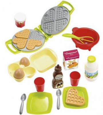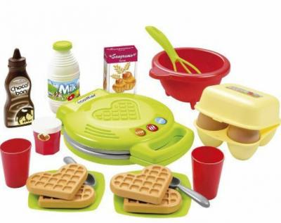 -Setul contine 22 de piese: aparat de facut vafe si 4 vafe in forma de inima, 2 pahare, 2 farfurii si 2 lingurite, bol cu tel, oua, lapte, faina, sos de ciocolata si gem de capsuni.