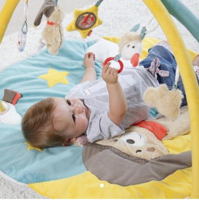 • materialele viu colorate cu diferite texturi, cele 5 jucarii din plus detasabile, oglinda si diferitele sunete emise la atingere contribuie la dezvoltarea simtului tactil, vizual si auditiv