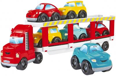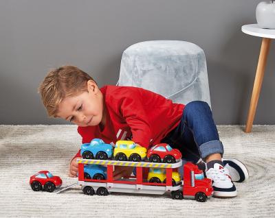 Camionul cu platou cu etaj, va fi foarte distractiv pentru micii transportatori, deoarece la camion apartin si sase masinute.