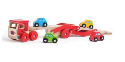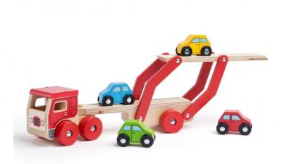 • acest camion transporta o incarcatura de patru masini colorate din lemn, potrivindu-se perfect pe platforma
