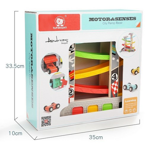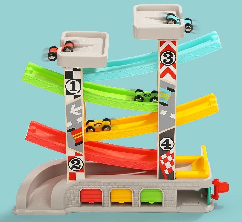 • copilul aseaza masinuta in partea de sus a rampei si o impinge usor, aceasta va urma traseul pana jos, la linia de sosire