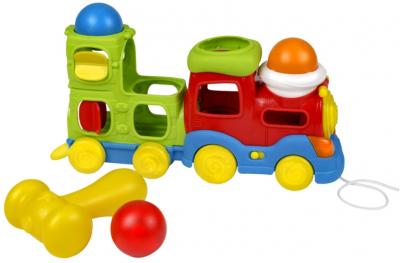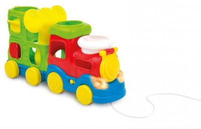 Trenulet muzical Winfun, cu bile si ciocan. Trenulet cu un vagon si 3 bile colorate. Trenuletul dispune de buton on/off. Acesta are diferite melodii insotite de lumini. Bilele pot fi stocate in interiorul vagonului. Acestea se pot impinge cu ciocanul prin locurile speciale. De asemenea are si ata de tras.