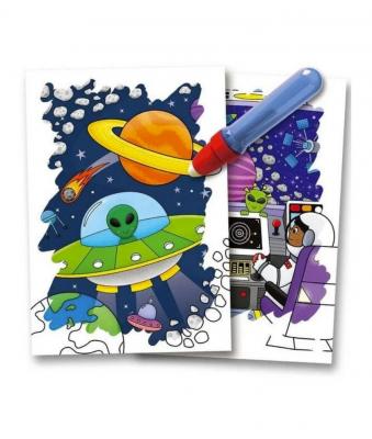 Aceasta carticica interactiva de colorat cu apa ofera copiilor o modalitate captivanta de a explora spatiul cosmic in timp ce isi dezvolta creativitatea, indemanarea si cunostintele despre Univers. Folosind stiloul magic umplut cu apa, cei mici pot descoperi imagini ascunse care apar pe masura ce coloreaza - iar magia nu se opreste aici: dupa 10 - 15 minute, paginile se usuca si pot fi colorate din nou!