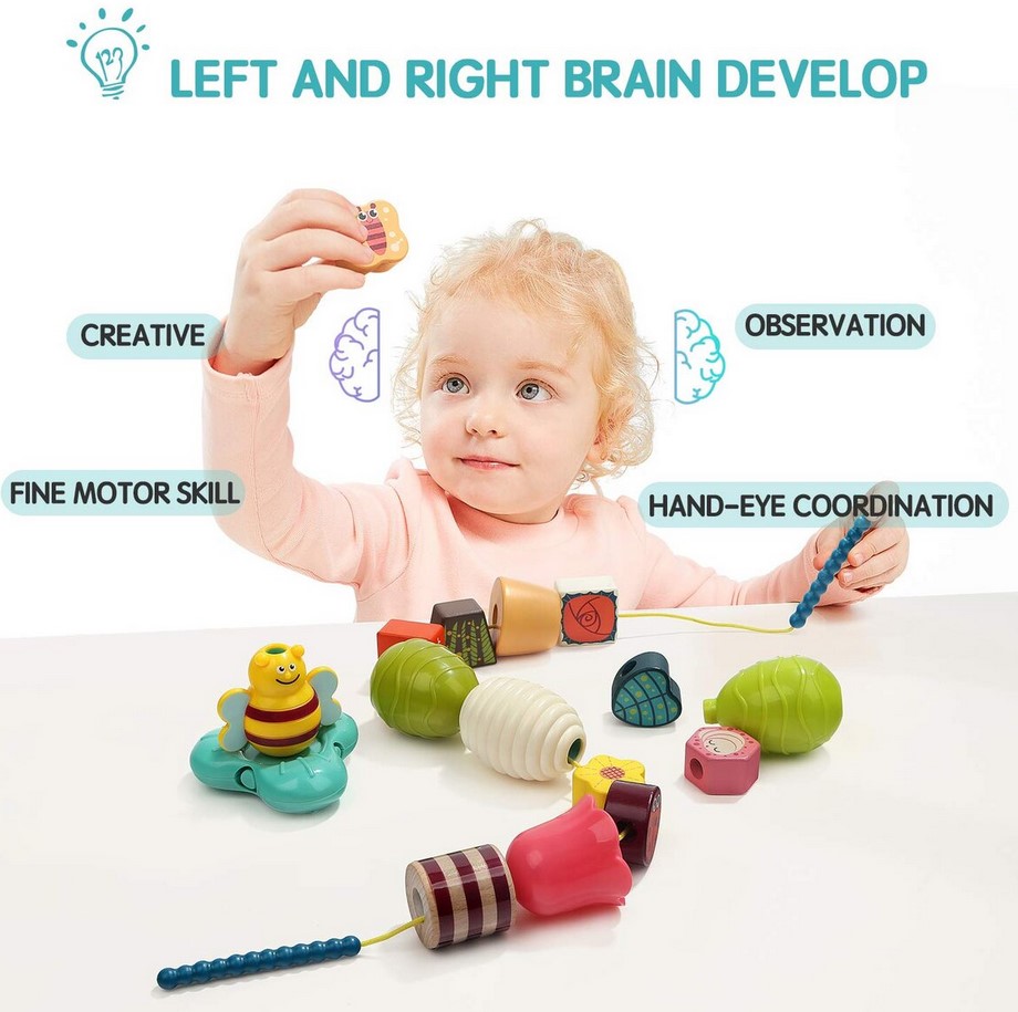 • poate fi folosita ca jucarie de snuruit pentru dezvoltarea abilitatilor motrice si a gandirii logice – toate componentele jocului au orificii prin care copilul va trece siretul inclus, snuruind incet, incet