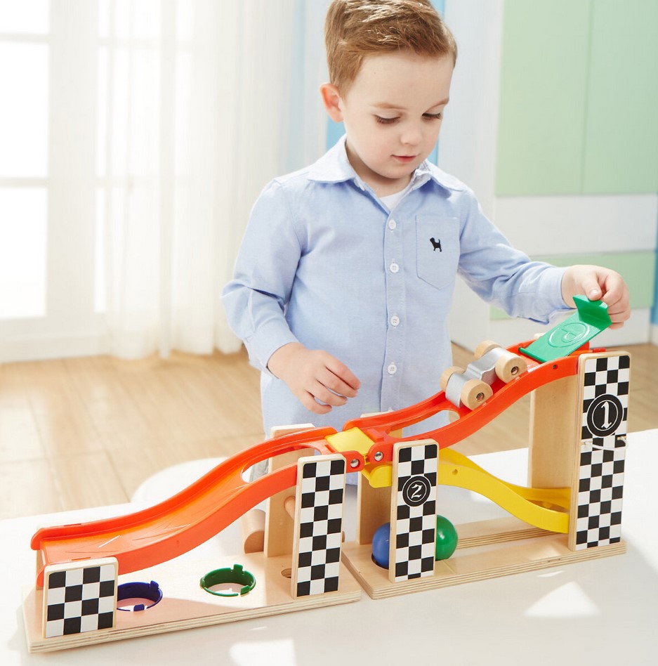 • copilul asaza masinuta in partea de sus a rampei si o impinge usor, aceasta va urma traseul pana jos, la linia de sosire