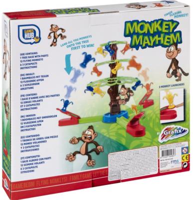 Regulament: Asambleaza baza cu cele 3 lansatoare si coroana copacului. Fiecare jucator isi alege o culoare si primeste 4 maimutele. Foloseste lansatoarele pentru a catapulta maimutele in copac. Jucatorul care reuseste sa puna toate maimutele in copac este castigator.