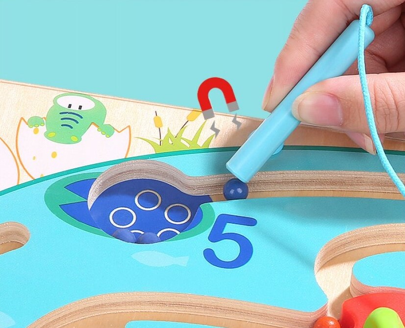 • folosindu-te de stiloul magnetic, ghideaza bilutele colorate prin labirintul cu o multime de obstacole, la cercul de aceeasi culoare