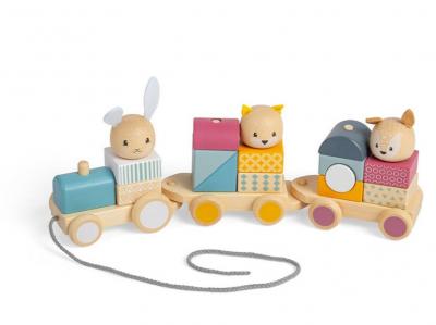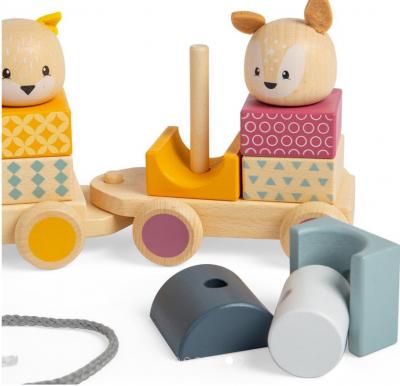 • setul include o locomotiva, doua vagoane transportatoare si trei figurine de animale din lemn, care pot fi luate si reasamblate intr-o varietate de moduri, ajutand la dezvoltarea dexteritatii si a abilitatilor de numarare