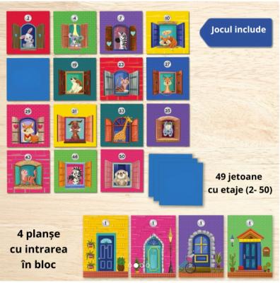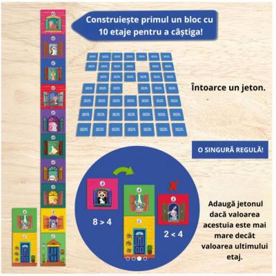 • Pune jetoanele cu etaje cu fata in jos pe masa si alege un card cu primul nivel al blocului (usa) pentru a incepe. Intoarce un jeton cu etaj. Decide daca il pui pe cladirea ta sau il pui inapoi la locul sau. Daca decizi sa-l pui inapoi, trebuie sa permiti tuturor celorlalti jucatori sa vada jetonul. Exista doar o REGULA - pentru a adauga un etaj nou blocului tau, valoarea acestuia trebuie sa fie mai mare decat valoarea etajului adaugat anterior.