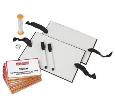 Regulament: Un joc istet si distractiv de desen. Alegeti un cartonas, dati cu zarul si desenati elementul indicat. Jucatorii isi pun pe frunte cartonasul desenat si ceilalti trebuie sa ghiceasca actiunea/personajul ilustrat cat mai repede, pana cand  se termina nisipul din clepsidra. Castiga jucatorul care ghiceste cele mai multe cartonase!