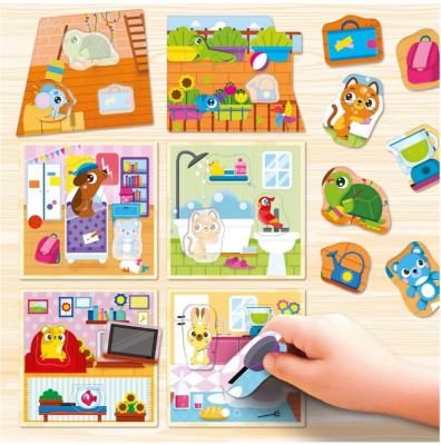 • de asemenea, sunt incluse o multime de cartonase cu imagini ale diverselor obiecte si animale pe care copiii trebuie sa le potriveasca in camerele corespunzatoare