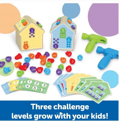 • setul contine tot ce este necesar pentru a incepe constructia: doua rame de casa, doua ciocane, 25 de cuie de plastic si un set de carti de joc special concepute pentru a oferi provocari matematice captivante