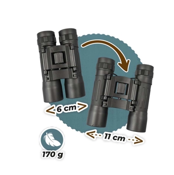 Cu ajutorul Binoclului Expert, copiii pot explora mediul inconjurator. Binoclul dispune de o putere de marire de 10x mai mare si dispune de o lentila obiectiv de 25 mm – aceeasi combinatie pe care o pot oferi modelele concepute pentru adulti. Cu toate acestea, acest binoclu a fost creat special pentru mainile copiilor. Fiind compact si cu o greutate redusa de doar 170 gr il face partenerul perfect pentru orice aventura. Binoclul se poate plia cu usurinta si se poate adapta la dimensiunea potrivita pentru copil.
