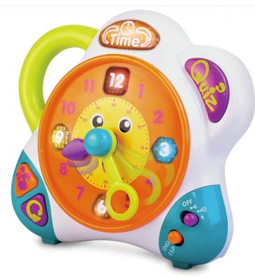 cu mod time: copilul muta limbile si ceasul spune ora respectiva sau mod quiz: in care ceasul cere copilului sa arate o anumita ora si copilul muta din nasuc limbile la ora corecta si este avertizat daca a raspuns corect sau nu