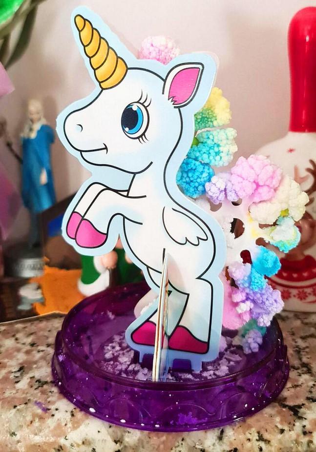 Mod de folosire: Asamblati unicornul format din piese de carton. Puneti piesele asamblate in baza de plastic si turnati lichidul furnizat. Mutati unicornul intr-un loc sigur si lasati-l timp de 12 de ore pentru a absorbi solutia. Priviti cum se transforma si cristalele incep sa apara si sa creasca.