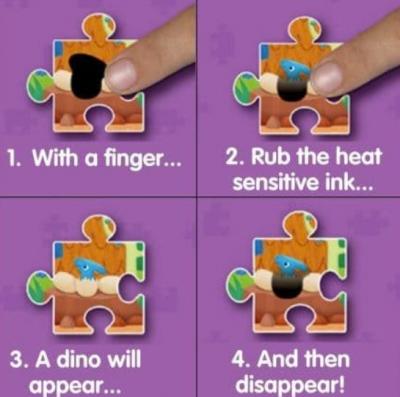 Un puzzle captivant din 50 de piese, care ascunde 15 zone magice ce transforma joaca intr - o experienta plina de uimire! Dupa ce copiii construiesc scena fascinanta, distractia continua: prin frecarea usoara a zonelor speciale, cerneala sensibila la caldura dezvaluie surprizele ascunse dedesubt.