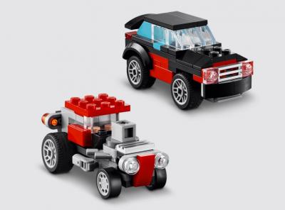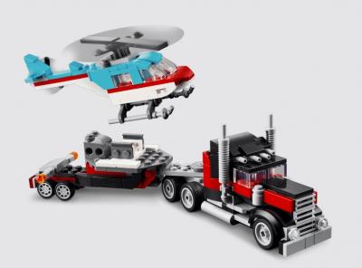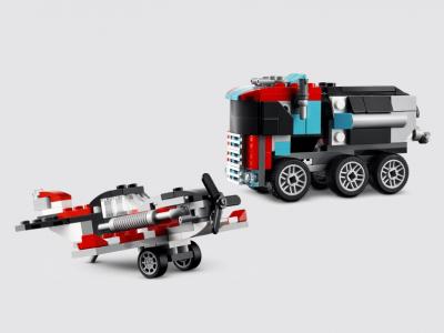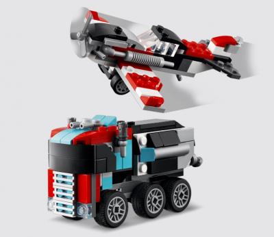 Cu aceasta jucarie LEGO Creator 3 in 1, copiii pot construi 3 seturi cu vehicule diferite, fiecare continand 2 vehicule. Acestia au ocazia sa construiasca Camioneta-platforma cu elicopter, s-o reconstruiasca intr-un avion cu elice si camion de combustibil cu roti mobile sau intr-o masina hot rod si un SUV pentru curse. De asemenea, pot folosi caramizile pentru a crea propriile vehicule.