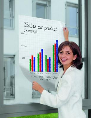 Rola cu 25 de folii electrostatice, perforatii la fiecare 80 cm, adera la aproape orice suprafata fara a fi nevoie de adeziv, poate fi suspendata pe orice flipchart standard, sustine notite si carti de vizita fara adeziv, se pot folosi pentru scriere cu markere.