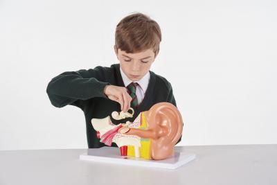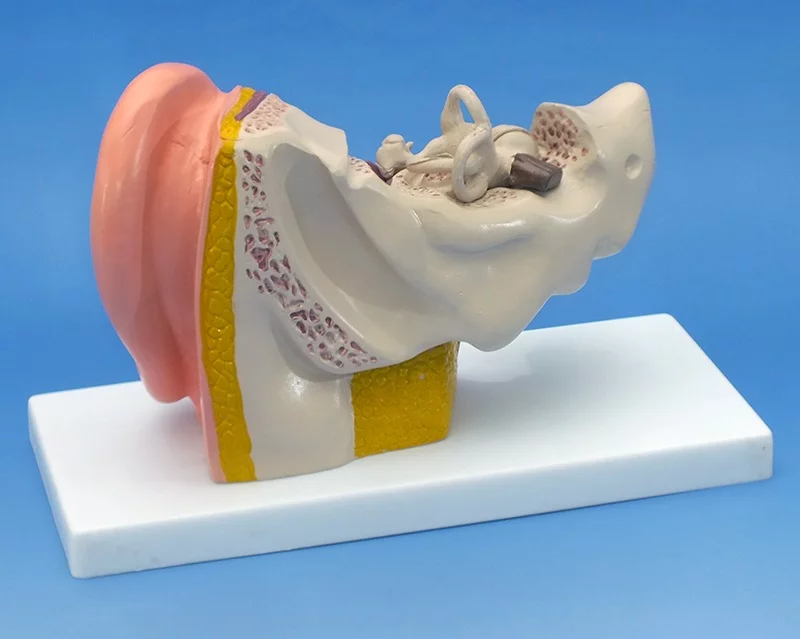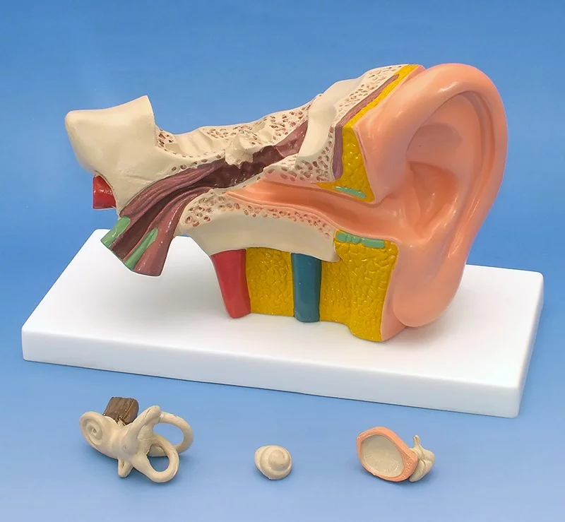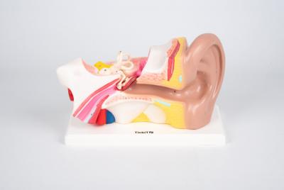 Acest model de inalta calitate reprezinta urechea exterioara, medie, si cea interna si are urmatoarele parti detasabile: timpanul cu ciocanul, scarita si nicovala si 2 parti de labirint cu cohleea si nervul auditiv side echilibru.