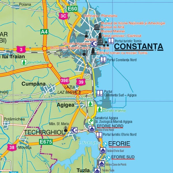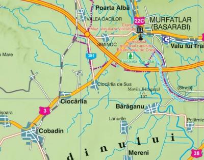 Harta Regiunea Dobrogea, cuprinde partea sud-estica a Romaniei si este delimitata de Delta Dunarii in partea de nord-est, Muntii Macinului la nord, Marea Neagra la est si granita cu Bulgaria in sud, fiind practic regiunea cuprinsa intre Marea Neagra si Dunare. Regiunea Dobrogea cuprinde atat cel mai vechi teritoriu al Romaniei, cat si cel mai nou pamant al Romaniei, acesta fiind reprezentat de Delta Dunarii formata din cele trei brate: Chilia, Sulina si Sfantu Gheorghe