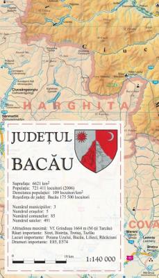 Harta de perete a judetului Bacau este o harta care cuprinde cu succes atat partea adminsitrativa, harta rutiera, cat si fizico-geografica a intregului judet. Harta a fost realizata de un colectiv de cartografi profesionisti si a fost verificata in prealabil de catre Institutiile abilitate din acest domeniu.