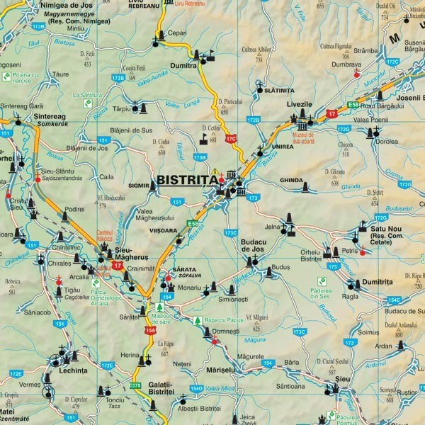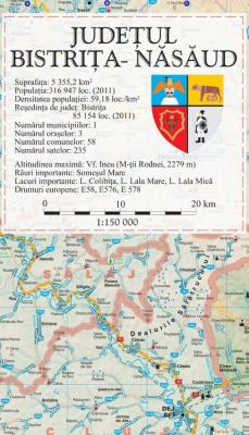 Harta de perete a judetului Bistrita-Nasaud cu datele de contact a tuturor primariilor din judet. Aceasta harta cuprinde informatii administrative, fizico-geografice si rutiere. Harta a fost realizata de un colectiv de cartografi profesionisti si a fost verificata in prealabil de catre institutiile abilitate din acest domeniu.