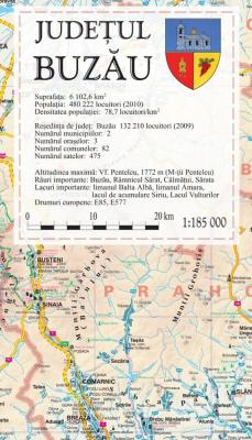 Harta de perete a judetului Buzau cu datele de contact a tuturor primariilor din judet. Aceasta harta cuprinde informatii atat administrative, fizico-geografice, cat si rutiere. Harta a fost realizata de un colectiv de cartografi profesionisti si a fost verificata in prealabil de catre institutiile abilitate din acest domeniu.