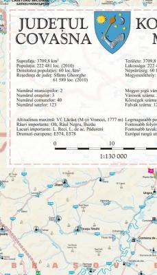 Harta de perete a judetului Covasna cu datele de contact a tuturor primariilor din judet. Aceasta harta cuprinde informatii administrative, fizico-geografice si rutiere. Harta a fost realizata de un colectiv de cartografi profesionisti si a fost verificata in prealabil de catre institutiile abilitate din acest domeniu.