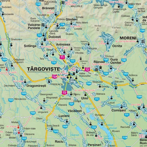 Harta judetului Dambovita este laminata cu folie subtire de protectie si dotata cu sipci de metal. Folia de protectie confera hartii o rezistenta in timp. Din acest motiv harta nu se rupe. Harta se poate scrie cu marker pe baza de apa, ulterior putand fi stearsa cu un servetel umed.